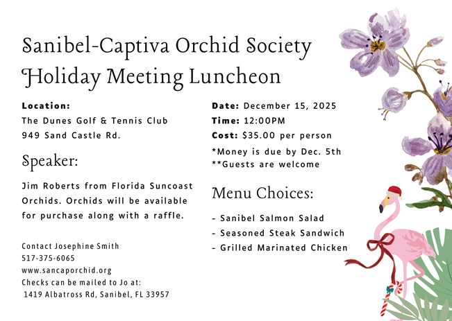 | December 15, 2025 | Holiday Luncheon-Dunes | Jim Roberts, Florida Suncoast Orchids - Encyclia ans Schomburgkia New Hybrids |